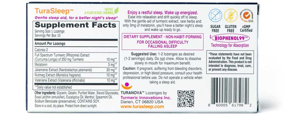 Introducing TuraSleep™ lozenges, your secret weapon for achieving restful and peaceful sleep. Crafted to complement your overall well-being, these lozenges encourage the perfect trifecta of daily exercise, a healthy diet, and good sleep habits.