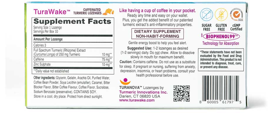 What’s in the mix? Turmeric, a golden spice sourced from the curcuma longa plant, is the primary ingredient. TuraWake® also contains caffeine, a natural stimulant found in coffee and tea, which is celebrated for its ability to promote temporary relief from fatigue.